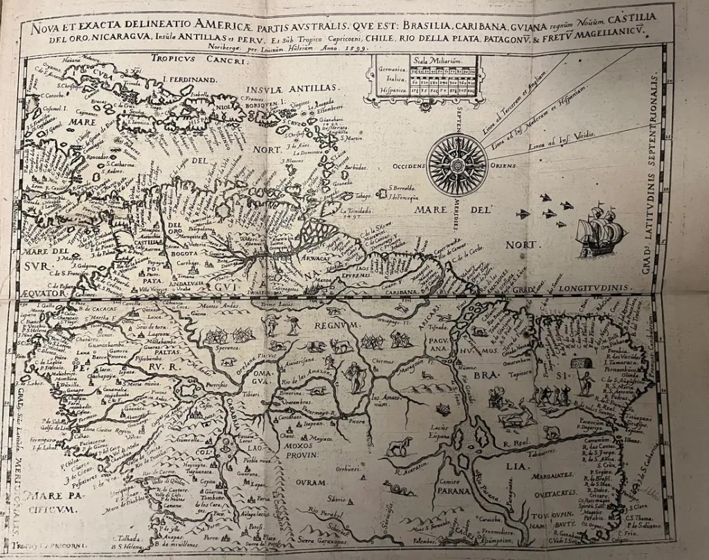 Included is a rare map of South America by Hulsius. This includes depictions of the fabled Lake Parime, illustrations of the flora and fauna of the region, and cannibalism – a common trope on European imaging of South America at the time.