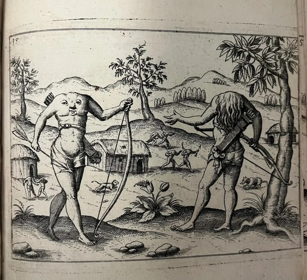 The account is punctuated by mythical accounts which dated back to the mediaeval period and earlier accounts by Pliny. These include the Ewaipanomas (people with faces on their bodies) and Female Amazonian warriors, which decorate the title page.