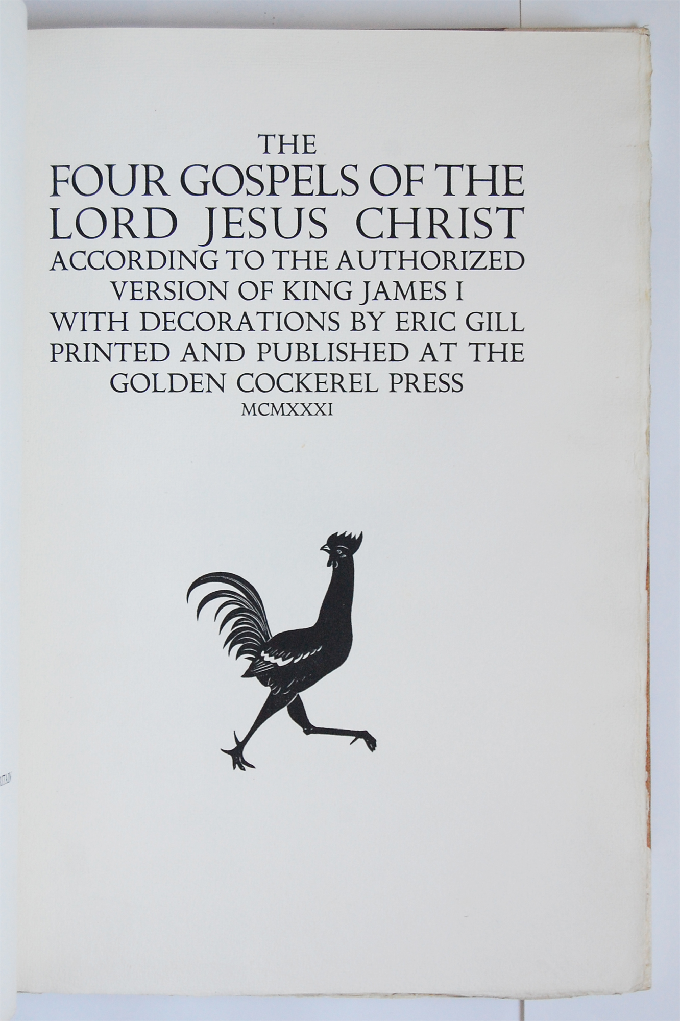 With 64 wood-engraved initial letters and illustrations by Eric Gill and printed by Robert and Moira Gibbings in Golden Cockerel type (designed for the press by Eric Gill) on Batchelor handmade paper with special watermark of a dove and the initials G.C.P. “Conceived in the fruitful mind of Robert Gibbings, this is the Golden Cockerel book usually compared with the Doves Bible and the Kelmscott Chaucer. A flower among the best products of English romantic genius, it is also surely, thanks to its illustrator, Eric Gill, the book among all books in which Roman type has been best mated with any kind of illustration” (Chanticleer). Eric Gill’s biographer, Fiona MacCarthy, describes The Four Gospels as “the culmination of (Gill’s) work for the Golden Cockerel Press and … the example which experts and collectors … have always viewed as the height of his achievement. To describe it as a series of engraved initial letters for the Bible text, though strictly correct, gives little idea of the richness and complexity of Gill’s own contribution. The decorative letters do not just embellish the text, they play upon it and develop it, to the point at which distinctions are blurred.” (Eric Gill: A Lover’s Quest for Art and God, pp.243-234).